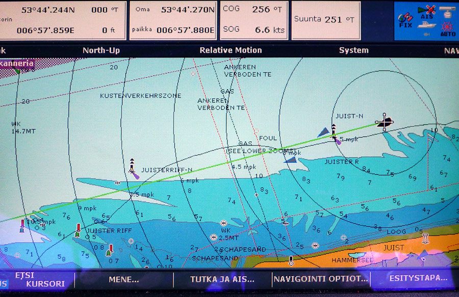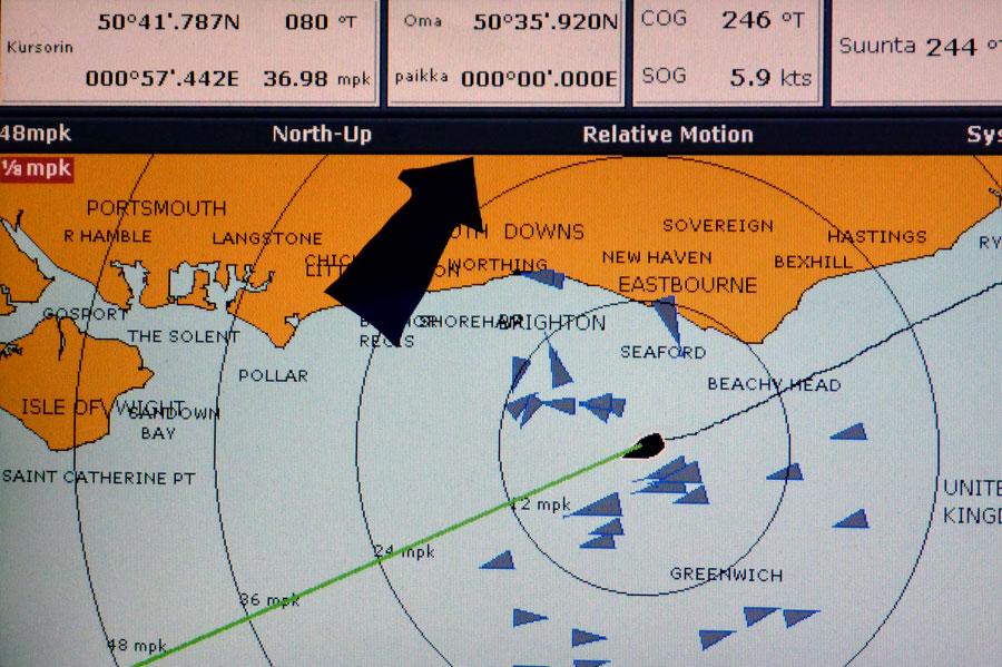 Uusi päivä valkeni Belgian rannikon edessä. Pelkkä keulapurje kiskoi Melinaa navakoituvassa tuulessa ja kasvavassa aallokossa. Vielä yksi tiukka laivaväylien ylitys oli edessä. Calais – Dover väliä suhaa edelleenkin lukuisa määrä lauttoja, vaikka Eurotunneli on siirtänyt ison osan liikennettä kiskoille merenpohjan alle. Koko Pohjanmeren liikenne kaahaa omia reittivyöhykkeitään pitkin lounaaseen ja koilliseen. Näiden väylien risteyskohdan poikki piti vielä päästä. Karttaplotteri, AIS ja tutka olivat loistavat apuvälineet tuohon hommaan. Voi niitä raukkoja, jotka aikoinaan ovat joutuneet selviytymään näistä tehtävistä ilman nykyajan heepeleitä.