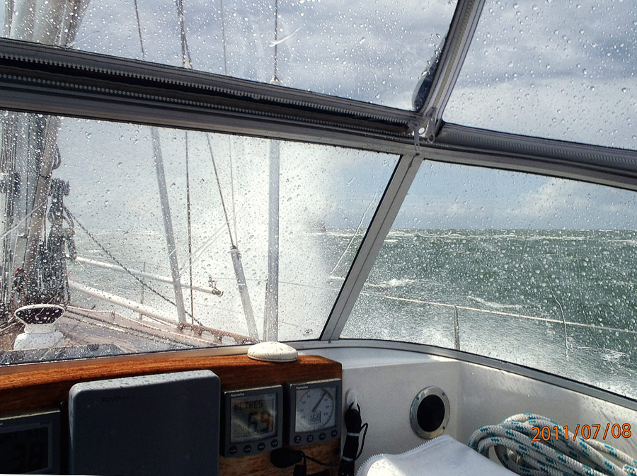 Tuuliosaston tarjonta oli laihanpuoleista ja yli puolet matkasta taitettiin Yanmarin tasaisessa hurinassa. Noin 40 mailia ennen Den Helderiä alkoi tuulla ja kunnolla ja tietysti suoraan nenästä ja tietysti vastavirta puski täysillä. Kryssiminen oli jotain säälittävän ja onnettoman rajamailla olevaa etenemistä. Viisi mailia vaati ainakin 15 mailin tarpomisen, jossa vesi lensi ja aaltojen harjat pärskyivät Melina tuulilasiin ja sprayhoodin päälle. Vetoketjun kulmasta tuli jopa pari tippaa vettä, se ei kuitenkaan vielä vaatinut goretexia pintaan.
