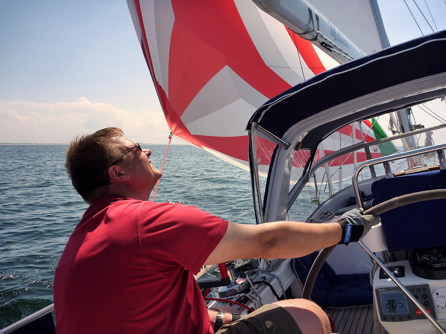 Aamun vuorovesivirrat suosivat lähtöä vasta puolenpäivän aikoihin ja sehän meille sopi. Tavoitesatama Scheveningen oli puolenpäivän matkan päässä. Kurssi oli lähes etelään ja tuuli pysytteli lännessä, joten kannelle nostettiin genaakkeripussi. Apparenttikulma oli vain 60 astetta, mutta tuulen nopeus vain nelisen metriä, joten yhtälön pitäisi toimia. Melinan genaakkeri on konstruoitu omalle rullalaitteelle, jossa on jatkuva jalus. Purje on nostettaessa tiukasti rullalla itsensä ympärillä, ja kun kaikki muu on valmista, rullataan värikäs nailoni auki. Idea on samanlainen kuin keulan rullapurjeissa, staagi vain puuttuu. Sama takaperin tarkoittaa purjeen laskua. Ensin rullalle itsensä ympärille, siten nostin auki ja käärme työnnetään pussiinsa. Tähänastiset kokemukset ovat olleet oivalliset. Toimii kevyesti, helposti ja nopeasti.