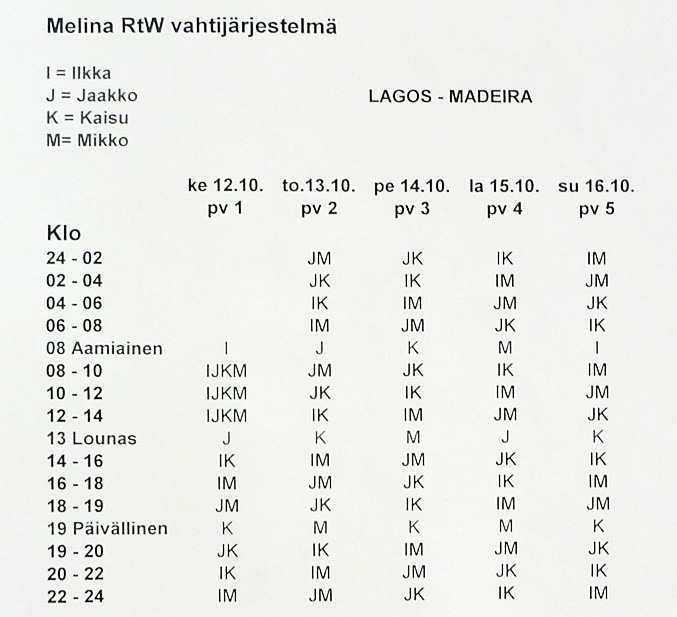 Tiistai olikin melkein kiireinen päivä, kun miehistön piti ensin tehdä laiturikatselmus, sitten piti tutustua sataman palveluihin, sitten pistäytyä kaupungilla, sitten hakea kärryllinen provianttia ja vielä lastata kuorma Melinan uumeniin. Illan suussa Kapu piti kohtuullisen perusteellisen esittelyn veneen moninaisista turvallisuusvarusteista ja niiden käytöstä. Veneestä poistuminen matkan aikana kiellettiin jyrkästi. Briefin päätteeksi Kapu naulasi seinään vahtilistan, jonka mukaan seuraavien vuorokausien elämä rytmittyy. Perustana oli kiertävä 4-tuntinen 2+2 vahti, jossa puoli vahtia vaihtuu kahden tunnin välein. Samalla siinä oli jaettu vuorot aamupalan, lounaan ja päivällisen tekijöistä. Siihen oli miehistön tyytyminen. Kapun kohdalle oli osunut ainoastaan lähtöaamiaisen hoitaminen, joka sujuikin jo rutiinilla. Se aamiainen tarkoittaa kahvin keittämistä ja jogurttipurkin ja mehulasin asettamista pöytään. Vaihtelua aamiaiseen tuo mehulasin sijoittelu vuorotellen jogurttipurkin oikealle tai vasemmalle puolelle.