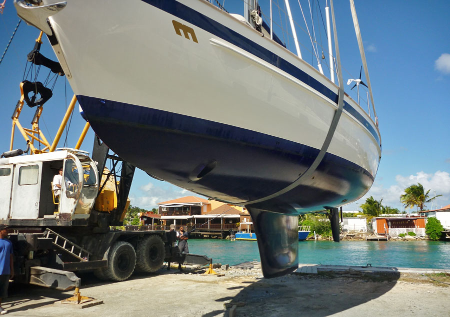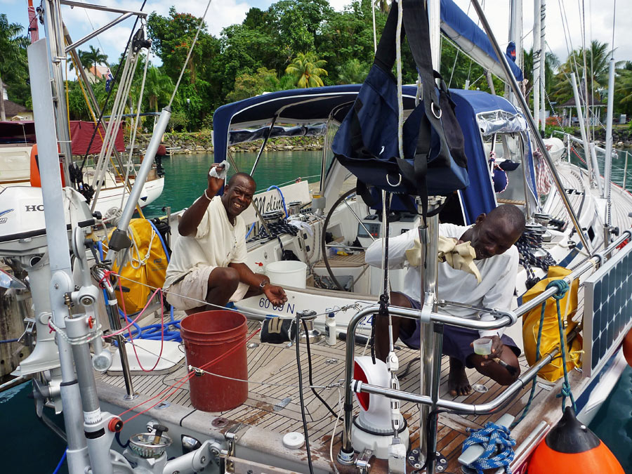 Kapu ihasteli telakan väen kanssa Melinan pohjaa, kun paatti nostettiin ylös Polybat Caraibesin telakalla tammikuun lopussa. Hyvin oli Interin Micron Extra torjunut kasvillisuutta. Alus oli telakalla ylhäällä neljä päivää ja saman verran telakan laiturissa. Siinä ajassa Kapu sai jopa veskien pumput vaihdettua uusiin ja asennettua uuden manuaalisen merivesipumpun pentryyn. Telakalla kaikki hoitui nuottien mukaan ja palvelu oli erinomainen. Omistajapari kiersi parin päivän verran saarta etsien Melinaan uutta Camping Gaz pulloa, kun kaikki olivat saarelta loppuneet. Ja löysivät. Polybat Caraibes on luotettava, ystävällinen ja kohtuuhintainen. Melina suosittelee!
