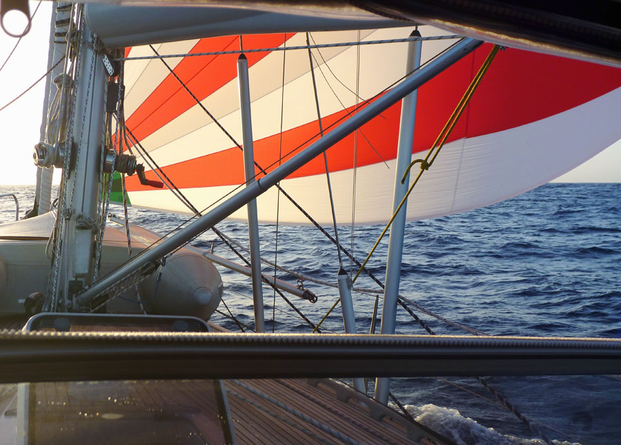 Ensimmäinen vuorokausi tarjosi kuuden solmun keskinopeuden, mutta sen jälkeen tuuli alkoi hyytyä. Vaihdoimme peliin ison ja genaakkerin, joilla vielä saatiin viitisen solmua vauhtia. Puolen yön maissa piti luovuttaa vauhdin tippuessa alle kolmen solmun. Seilit pantiin kasaan ja Yanmar pärähti päälle. Toisen vuorokauden täyttyessä matkaa oli tehty lisää vain 121 mailia. Plussapuolelle jäi aika tasainen meri ja hieno kuutamo.
