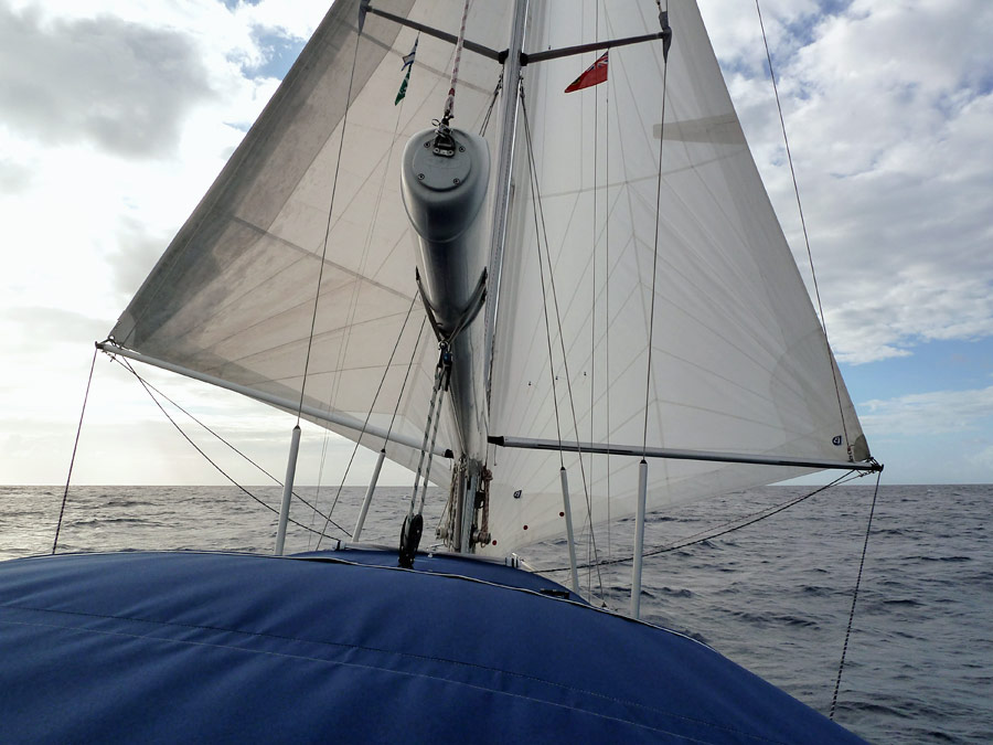 Haitin eteläpuolella pääsimme taas hetken seilaamaan, sitten motoroimaan, sitten seilaamaan. Ja väliin hybridiä, jolloin kone avusti purjehdusta tai päinvastoin. Eli hyvin vaihtelevaa menoa. Yöllä useampi kuuro pyyhkäisi yli hoitaen kannen huuhtelun. Sadekuurot olivat ajoittain aika rankkoja, joten laskimme verannan seinät alas ja nautimme illallista ulkopöydässä kuivassa kaukalossa. Muutama yö oli umpipimeä pilvien peittäessä kaiken taivaanvalon. Tutkalla silmäiltiin silloin tällöin ympäröivää merialuetta, jossa ei ollut mitään. Tai ehkä se laiva päivässä.