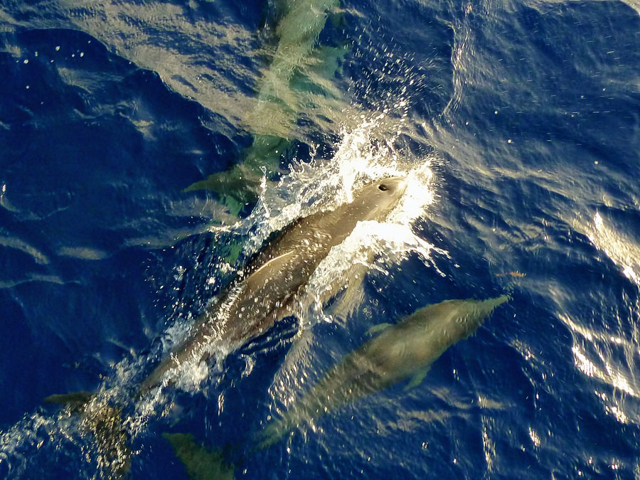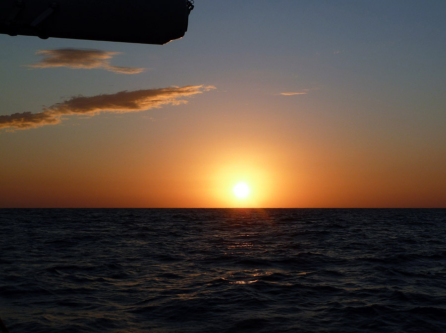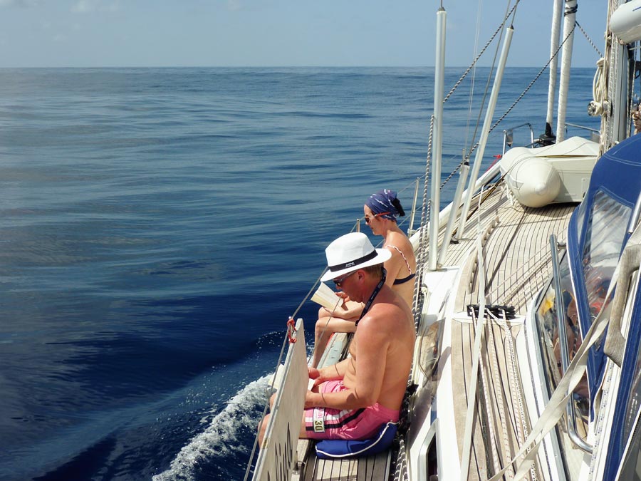 Dominikaaninen Tasavalta näkyi heikosti pohjoispuolella, kun Melina jyskytti koneella tyyntä veden pintaa. Se toi delfiinejä leikkimään keula-aaltoon, joka sai Mervin ja Pekan innoissaan kannelle. Sen jälkeen delfiinit vierailivatkin päivittäin. Ajoimme vahdissa kolmen tunnin jaksoja kukin vuorollaan, joten uniaikaa jäi vallan reilusti. Mervi ja Pekka vastasivat pentrystä suvereenisesti. Kapulla ei ollut sinne paljon asiaa, joskus sentään pääsi tiskipaljun reunaan.