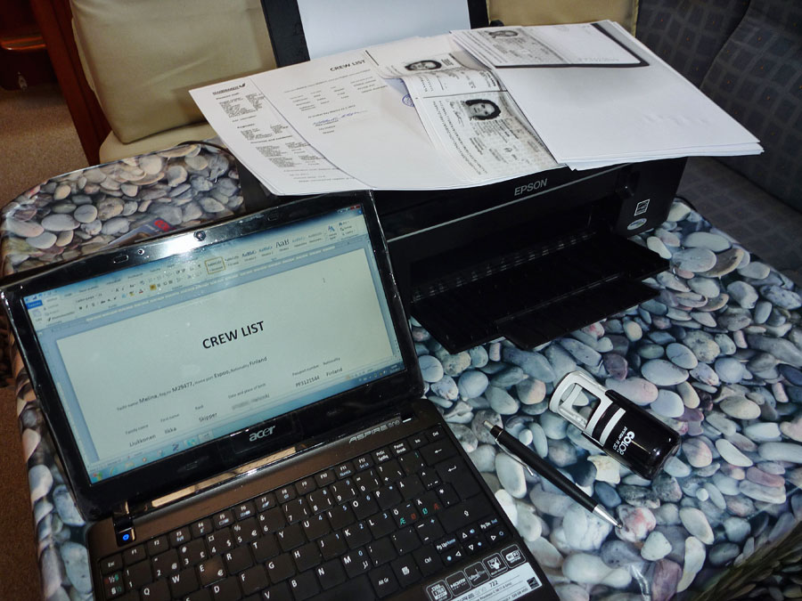 Epäluuloinen punatukka kävi huolella läpi kaikki paprut. Meillä oli myös pari passivalokuvaa koko miehistöstä, jotka tarvittiin yhteen papruun. Sen kulmaan piti vielä antaa peukalosta sormenjälki. Kapulla oli myös yhteensä 10 kopiota passeista, alustodistuksesta ja miehistöluettelosta. Leimoja siellä ja täällä. Nyt alkoi kelvata, mutta sitten toimiston peecee meni pimeäksi. Homma jatkui käsipelillä. Välillä tuli kuitti, joka piti käydä maksamassa naapurihuoneessa ja sitten takaisin leimatun kuitin kanssa. Taas otettiin kopioita, sitten nuoltiin leimamerkkejä, jotka liimattiin passiin. Tunnissa saatiin kaikki kuntoon ja punatukka käski selvin sanoin meidän poistua hänen silmistään. Tottelimme ilomielin.
