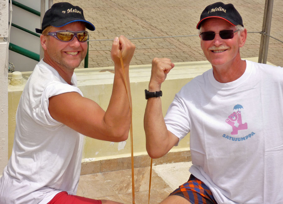 Mervin ja Pekan kanssa on kolme viikkoa seilattu yhdessä. Taakse on jäänyt 1400 merimailia Karibian merta. Ja 1400 merimailia kivaa yhdessä seilaamisen iloa. Siihen on mahtunut monenmoista herkkua, sekä merellä että maissa, kannella ja ruokapöydällä. On se niin kiva, että on tällaisia ystäviä, joiden kanssa voi jakaa purjehduksen iloa.