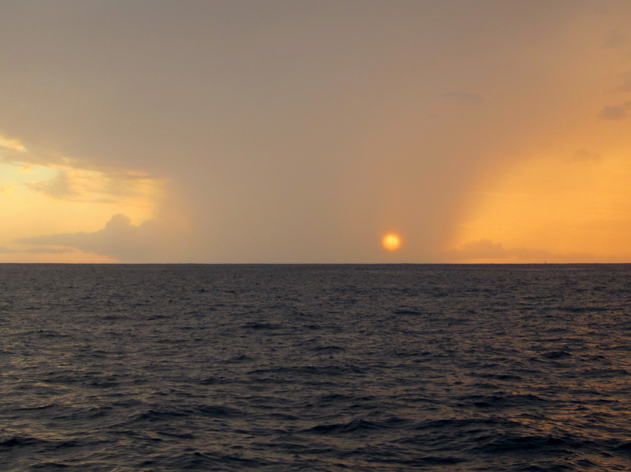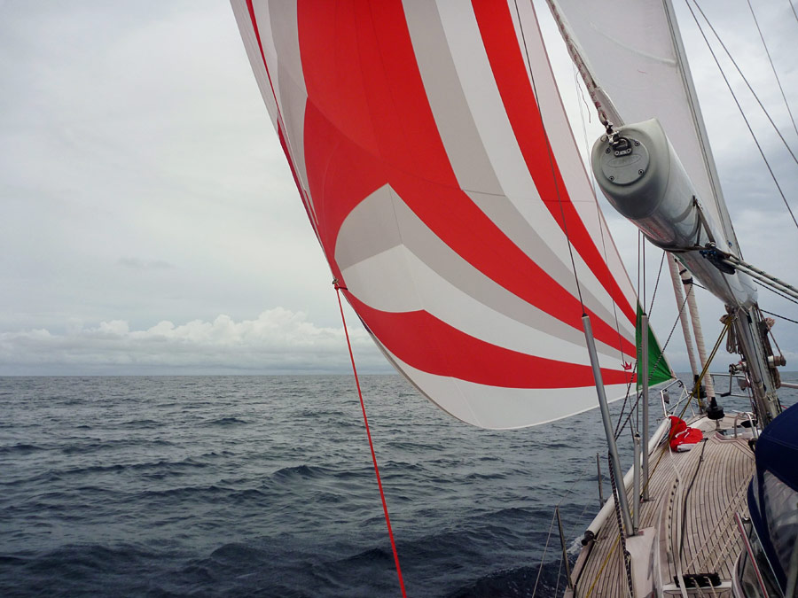 Parina vuorokautena etenimme vain reilut sata mailia, koska käytimme koneessa alhaisia kierroksia polttoaineen säästämiseksi. Mutta sitten pääsimme pasaatin kyytiin, ja se meno vei perille saakka. Konetunteja etenemiseen kertyi matkan aikana yhteensä noin 40. Saman verran teimme sähköä erityisesti vesikoneen käyttöön. Pasaatikin vaihtoi vähän väliä suuntaansa ja voimaansa. Mekin ajelimme vuoroin genualla, vuoroin genaakkerilla. Välillä isossa 1-reivi ja usein 2-reivi öisin, jotta puuskissa ei tarvinnut herättää muita kannelle. Valtaosan matkasta keula oli virsarilla puomin kanssa, välillä puomi myös suojan puolella. Tuulen suunta oli harvoin ihan myötäinen, joten goosewing-viritys jäi muutamaan päivään.