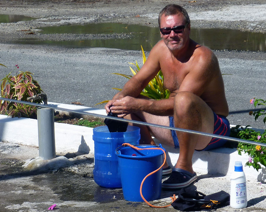 Vain muutama tunti saapumisemme jälkeen mustat pilvet peittivät taivaan, ja sitten alkoi tapahtua. Tuuli vinkui mastossa yli 30 solmun voimalla ja ankkurikettinki rahisi pohjan korallipaakuissa. Trooppinen sade rummutti kanteen vieden näkyvyyden melkein kokonaan. Viidenkymmenen metrin päässä olevat veneet katosivat harmauteen ja Melinan oivallinen veranta alkoi tihkua läpi katoksen vetskareiden kohdalta. Malö -purjehtijan painajainen alkoi toteutua; istuinkaukalo oli märkää, ennenkuulumatonta. Ihan meni sisäruokintaan pari iltaa. Istuimme salongin pöydän ääressä ja kuuntelimme sateen rummutusta, jota säesti ukkosen kumu. Pari päivää siinä nautittiin harmaudesta, ja iltapäivät elokuvista. Laatuleffoja molemmat; Kaunis mieli ja Kuninkaan puhe. Sitten taivas aukeni kirkkaan sinisenä ja kaikki likomärät pinnat höyrysivät hetkessä kuiviksi. Olimme palanneet normaaliin päiväjärjestykseen.