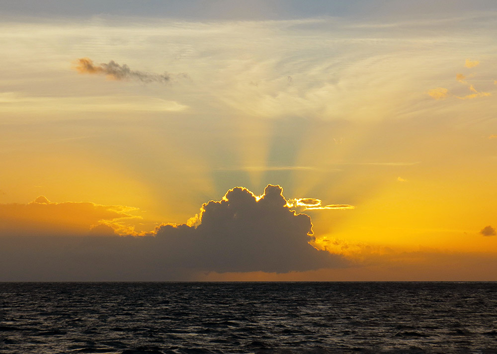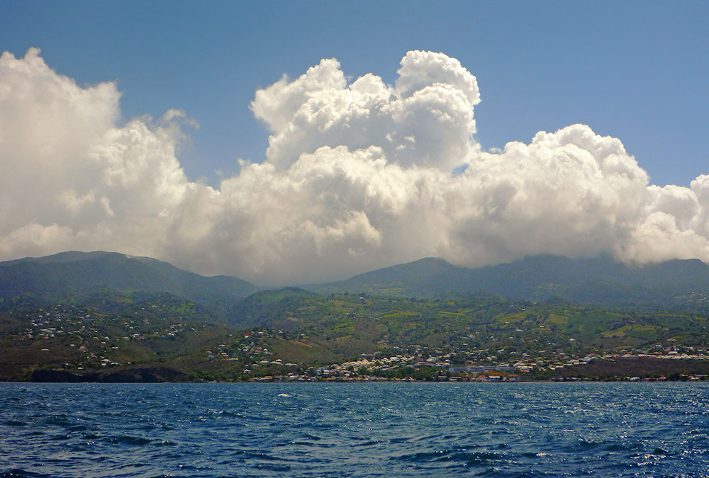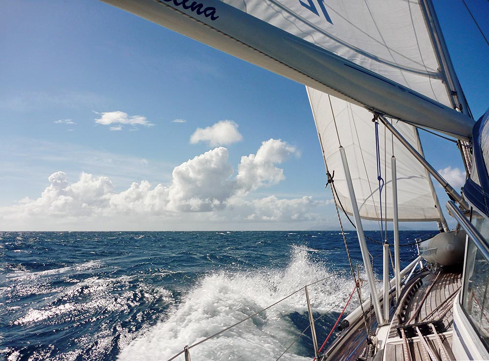 Aamun kajo oli vasta alkanut syödä pimeyttä, kun jo nostimme ankkurin. Edessä oli pitkä päivä. Matkaa Ile de Saintesin lahdelle noin 90 meripeninkulmaa. Mutta onneksi oli pitkäperjantai. Tuulikin heräsi auringon valoon ja ryhtyi hommiin. Pian oli 20 – 25 solmua, puuskissa 30. Melinan mastossa kakkosreivatut isopurje ja kutteri muuttivat tuulivoiman 7 – 8 solmun venevauhdiksi. Puolen päivän maissa tuuli hyytyi Dominican eteläkärjen jälkeen ja jatkoimme hybridiversiona, kunnes saaren pohjoispäässä tuttu meno taas jatkui. Se tiesi hyvää, sillä halusimme ehtiä perille ennen pimeää. Iso ryhävalaskin näytti pyrstönsä Melinan edessä. Hetken aikaa miehistö tähysti silmät sikkuralla, mutta muita yksilöitä ei kohdalle sattunut, hyvä niin. Koko iltapäivän tummat pilvet roikkuivat päällä ja ankarat sadekuurot yrittivät huuhtoa meriveden kastelemaa kantta. Illalla kuuden jälkeen kurvasimme Iles des Saintesin täpötäydelle ankkurilahdelle, jossa vapaita poijuja oli turha kysellä. Lopulta laskimme ankkurin Pan de Sucren pieneen lahteen. Ensin normaali ankkurin pidon tarkastus, ja sitten kiireesti jääkaapille. Aurinko oli jo melkein horisontin takana.