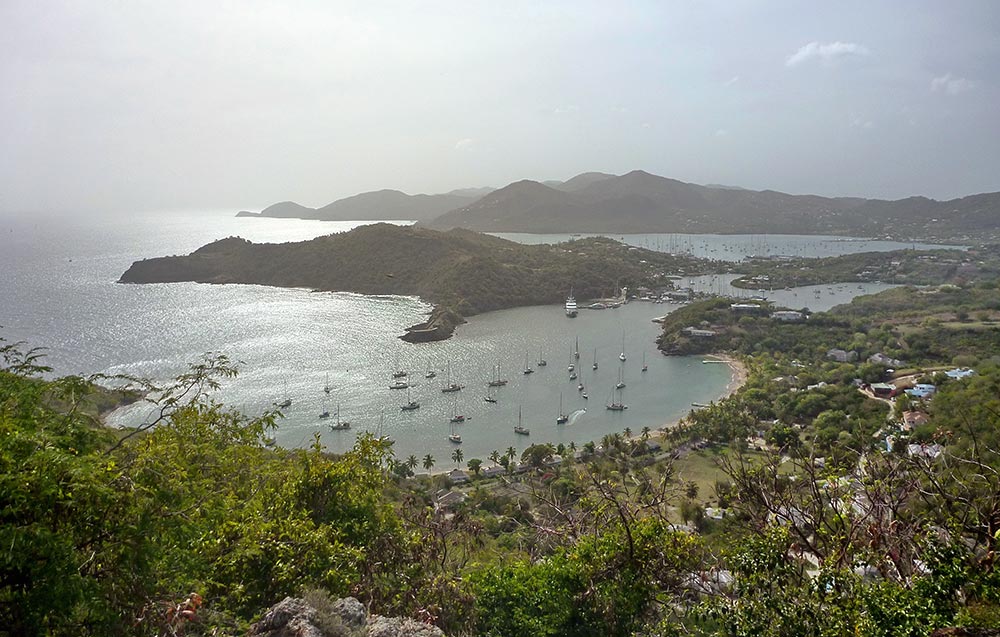 Koko yön satoi, välillä runsaasti, välillä rankasti. Kello ei ollut edes seitsemää aamulla, kun Bruce nousi hiekasta ja me otimme kurssin Antiguan Jolly Harbouriin. Päivä kului purjesulkeisissa. Ensin iso ja genua, sitten kutteri keulaan, sitten takaisin genua, sitten Yanmar töihin, sitten iso ja genua, sitten taas jotain muuta. Mutta iltapäivän lopulla kaarsimme Jolly Harbourin clearauslaituriin. Saimme kirjattua itsemme sisään juuri ennen paikkojen sulkeutumista ja sitten palasimme sataman eteen ankkuriin. Aika nasta paikka katsoa geeteelasin läpi auringon laskua mereen.