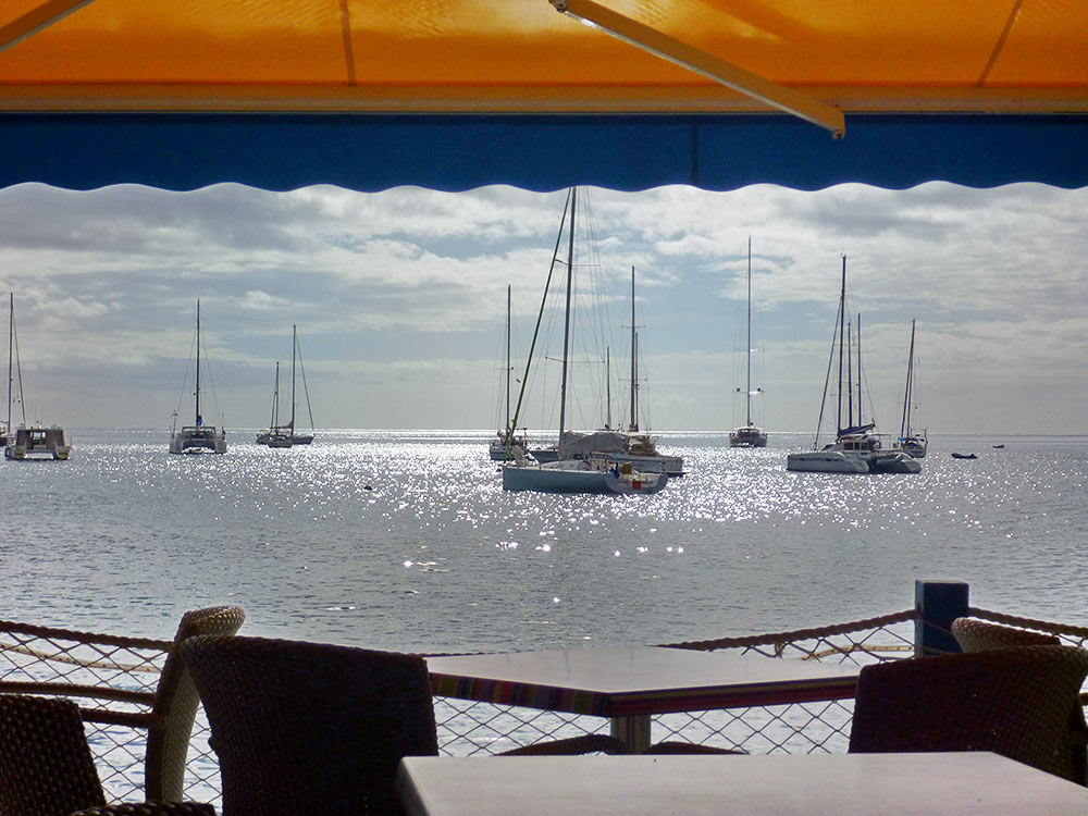 Uusi aamu ja menoksi. Nyt matkaa oli vain reilut 30 mailia, mutta jo aamukahdeksalta pelkkä genua kuljetti huvijahtia oivallisesti kohti Guadeloupen lounaiskulmaa. Sen kulman jälkeen tuuli sitten tilttasi kuin seinään. Sekotuulta metri tai kaksi. Oli aika kääntää Jammun avainta. Puolen päivän maissa Cousteau Marin Park oli mailin päässä. Päätimme pysähtyä sinne päiväpulahdukselle, jos vaikka niitä värillisiä kaloja olisi nähtävissä entiseen malliin. Vaan toisin kävi. Puolen mailin päässä alkoi tuulla. Kuin napista painamalla puhalsi taas 15 – 20 metriä suoraan sivulta. Ei ollut enää oikein uintikeli. Ohitimme pikkusaaren ja kutterilla hurjastelimme parissa tunnissa Deshaiesin lahdelle ankkuriin. Nyt Bruce pureutui pehmeään hiekkaan kuin tauti. Nostimme vielä ankkuripurjeen pitämään veneen nokan paremmin tuuleen. Tällä lahdella olemme viettäneet monia, monia päiviä pitämässä tuulta – niin nytkin. Lahti oli lähes täynnä veneitä, eikä kellään ollut intoa lähteä jatkamaan matkaa pariin päivään. Mekin nautimme oikein eteen kannetun aterian rannanreunan kuppilassa ja ihastelimme maisemaa; kauniita veneitä ankkurilahdella.