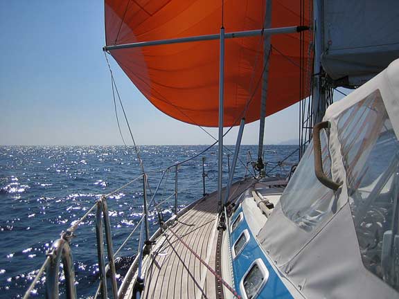 Cartagenan ja Almerimarin välillä on harvakseltaan satamia ja nekin pieniä ja matalia. Kaikki satamalahdetkin ovat avoimia itäiselle tuulelle. Itäinen peruslevante puhalteli mallikkaasti, joten lähdimme Cartagenasta aamulla seitsemältä kohti 110 mailin päässä olevaa Almerimaria ja Costa del Solia. Koko aamupäivän tuuli pysytteli alle seitsemän metrin lukemissa ja Melina eteni kevyesti virsarilla. Yleensä puolen päivän jälkeen tuuli tanakoituu, mutta nyt kevyt myötäinen vain jatkui. Kahdelta päätimme vaihtaa genuan spinnuun. Kai 146 neliötä nailonia jotain saa aikaan. Kyllä sai, koska varttia myöhemmin tuulimittari tarjoili yli kympin lukemia. Illalla surffailimme kevyesti kymmenen solmun molemmin puolin. Costa Blanca päättyy ja Costa del Sol alkaa Cabo de Gatan kulmasta, jossa rannikon reuna kääntyy lähes 90 astetta. Kokemuksesta tiesimme, että tällaisissa paikoissa tuuli yleensä tuplaantuu. Riisuimme nailonit ja spiirasimme genuan suojan puolelle. Sitten alkoi tuulla. Melina surffasi 10-11 solmun nopeudella pitkiä jaksoja. Nyt vuorostaan kapu ajoi pohjat; 12,7 solmua. Almerimar lähestyi vauhdilla. Ison laskeminen 15 metrin tuulessa ja korkeassa mainingissa sysipimeässä yössä ei ollut ihan pikkujuttu. Försti puettiin liiveihin ja valjaisiin ja lähetettiin kannelle kiskomaan 60 neliötä spectraa alas. Kapu kiskoi toisella kädellä reiviköysistä takaliikkiä kasaan ja toisella laski ison nostinta alas. Konsta Pylkkäsen välikäsi olisi ollut kova juttu. Veneen keula nousi ja laski korkeassa aallokossa rajusti, joten förstin apinataidot mastolla olivat koetuksella. Hyvin tuo selvisi.