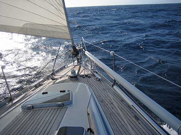 Pitkästä aikaa taivaalla oli tummia pilviä ja sadettakin ripotteli jonkun tunnin. Lämpötilakin tuntui suorastaan viileältä ollen vain + 25 C. Rivakka avotuuli kuljetti Melinan pelkällä keulalla takaisin Santa Ponsan lahdelle. Loppumatka oli jo luovia, jolloin Jukalle ja Tuikulle valkeni miten huimaa menoa Melina tarjoaa pelkällä keulalla. Vauhtia 6,8 solmua ja suhteellinen tuulikulma 30 astetta.