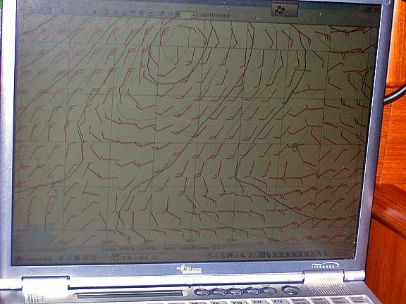 Pystymme hyvin vastaanottamaan ja lukemaan sähköposteja, mutta niihin vastaaminen on hankalaa, koska läppärin näppis kärsii merivesioireista. Tämän voi lukea siten, että tänne on kiva saada viestejä, mutta antakaa anteeksi, kun emme vastaa niihin. Antti lähettää meille päivittäin sääanalyysin ja oman näkemyksensä. Me tilaamme sähköpostilla joka päivä Atlantin tuulikartat ja saamme vielä ARC:n sääennusteen. Niillä nuoteilla teemme päätökset omasta suunnastamme ja reitistä maaliin. Nyt olemme St.Lucian tasolla, joten peruskurssi on suoraan länteen. Kyse on kummalla halssilla kannattaa leikata tuulen ollessa idässä.