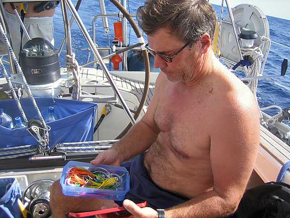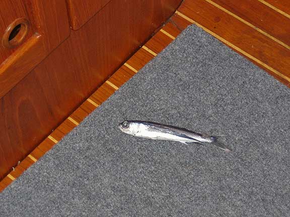 Jukka oli hankkinut kalastamista varten pienen setin syöttejä ja rullan järeätä siimaa. Heti alkumatkasta kokeilimme kalaonnea ja vain parin tuntia myöhemmin perässä polski dorado. Pienihän se oli, mutta Jukka hoiti sen ammattimiehen ottein pannuun asti. Sinä iltana meillä oli alkupalana tuoretta kalaa. Sen jälkeen ei aika eikä tarmo ole oikein riittänyt kalastamiseen ennen kuin vasta kevenevässä myötäisessä. Lentokalat ovat olleet asiasta eri mieltä. Joka aamu olemme keränneet kannelta 5-10 sinttiä. Yksi lentokala onnistui pääsemään melkein pannuun. Se lensi pentrin avoimesta ikkunasta sisään ja mätkähti hellan eteen lattialle. Pienen harjoittelun jälkeen pannuhyppy voisi vaikka onnistua.