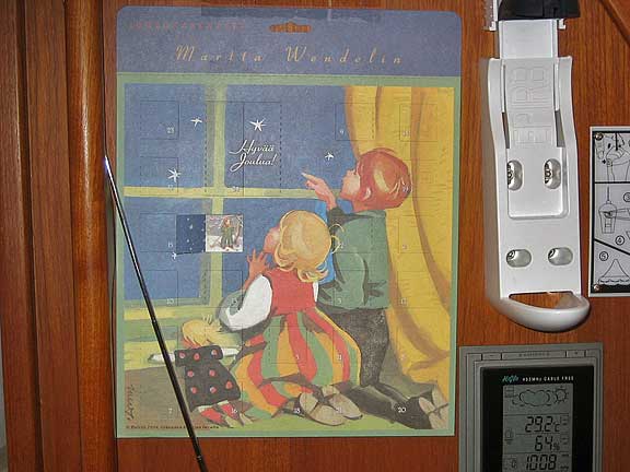 Försti ja Hanna toimivat koko ajan aluksen muonitusmestareina. Joka aamu kahdeksan jälkeen nautimme yhdessä kunnon aamupalan; milloin puuroa, milloin pekonimunakkaan, milloin mysliä. Kevyt lounas oli iltapäivän alussa ja ennen iltapimeää oli kahden, joskus jopa kolmen ruokalajin hieno illallinen. Ne olivat aina upeita hetkiä yhdessä. Vahdit kiersivät, tunnit kiisivät, päivät vaihtuivat. Olimme alkaneet elää omaa säännöllistä merielämää, johon eivät maalliset murheet liittyneet. Lauantai iltana 3. joulukuuta oli luvassa seuraava juhla. Silloin meni viimeinen tonni rikki. Maaliin alla 1000 meripeninkulmaa. Vielä ei kaivettu fendareita.