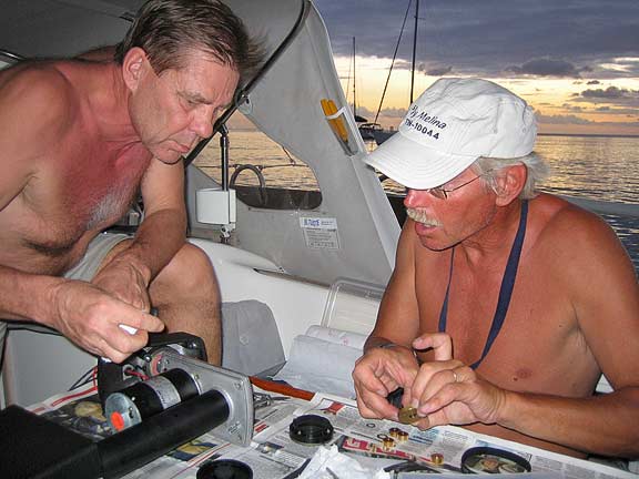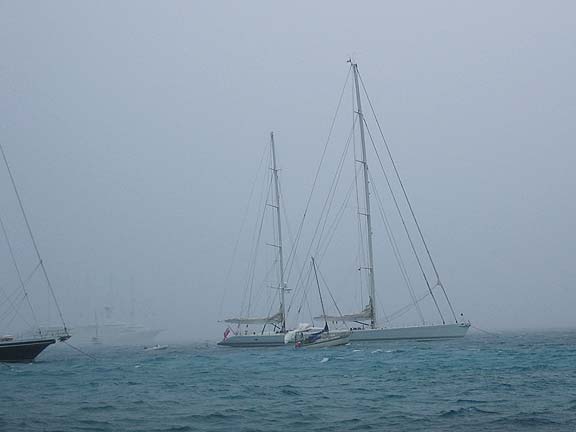 Laitoimme kumiveneen veteen, Hondan peräpeiliin, sukellusmaskit ja muut varusteet kyytiin ja lähdimme ajelemaan pienten saarten ja riuttojen väliin. Vedenalainen maailma ei ollut parhaimmillaan, koska kasvava maininki sekoitti kirkkaan veden ja esti sukeltelun uloimmilla riutoilla. Paluumatkalla veneelle näimme ankkuroitujen jahtien joukossa yhden Suomen perälipun, joka piti tietysti mennä tarkistamaan. Sy Ninni se sieltä löytyi; Mikko oli tuttujen merikarhujen Pertin ja Juhan kanssa seilannut Atlantin yli ja oli matkalla Trinidadin kulmille. Kutsuimme herrat ja gastien paremmat puoliskot Melinaan päiväkahville, kunhan juuri lähestyvä saderintama olisi mennyt ohitse. Ne kahvit jäivät juomatta, sillä nyt alkoi tuulla todella napakasti ja vettä tuli paloruiskusta. Meillä oli 20 kg:n Bruce hautautunut syvälle hiekkaan 5 metrin syvyydessä ja ulkona oli 40 metriä 10 millistä kettinkiä. Onneksi försti oli ehtinyt ennen kelin kovenemista tarkistaa ankkurin sukeltamalla. Tuulimittari viuhui 16-18 metriä koko ajan, ja illan mittaan sitäkin kovemmat puuskat olivat melkein jatkuvia. Yöllä paras lukema oli 21 metriä sekunnissa ja lokin anturi pyöri koko ajan noin solmun virrassa. Nukuimme koiran unta ja vähintään puolen tunnin välein jompikumpi kurkki ulos yrittäen nähdä pimeydessä olimmeko pysyneet paikallamme vai oliko ankkuri alkanut rekata. Ei ollut.