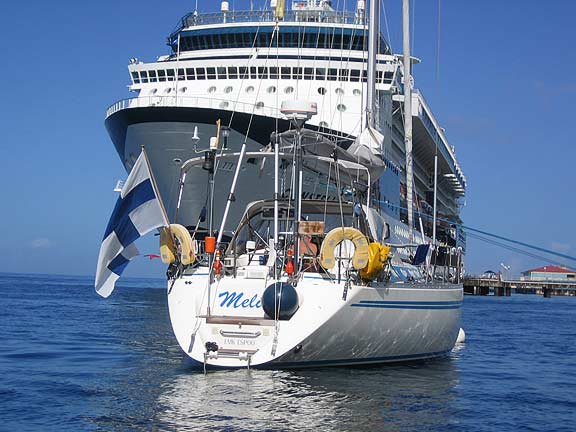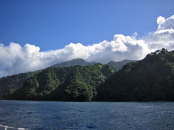 Aamulla otimme uudestaan köydet irti ja nyt todella lähdimme jatkamaan matkaa Arjan ja Karin huudellessa laiturilla "perässä tullaan". Itäinen pasaati puhalteli tasaisesti 10-12 metriä, joten etenimme täydellä genualla ja kakkosreivatulla isolla Guadeloupen reunaa takaisin saaren länsilaidalle reilun 40 mailin päässä olevalle Pigeon Islandille. Aurinko paistoi lähes kirkkaalta taivaalta ja vältimme kaikki siellä täällä vaeltavat sadekuurot. Pigeon Island ja sen ympäristö on Coustean perustama vedenalainen luonnonpuisto, joka on varsin suosittu sukellus- ja snorklauspaikka. Ankkuroimme Melinan Guadeloupen puolella olevaan suojaiseen lahteen ja lähdimme heti jollalla vajaan mailin päässä olevaan vesipuistoon. Vajaan tunnin sukeltelu korallien, värillisten kalojen, merivuokkojen ja mustekalojen keskellä kirkkaassa vedessä riitti jopa förstille, joka jo kovasti pohtii scuba-kurssin käymistä. Jotenkin meistä tuntui, että edellisellä kerralla 10 vuotta sitten korallit olivat paljon värikkäämpiä kuin nyt ja kuolleen korallin määrä olisi lisääntynyt. Yökin oli melkein sateeton ja Melina keinutti meidät rauhalliseen uneen.