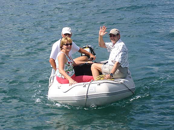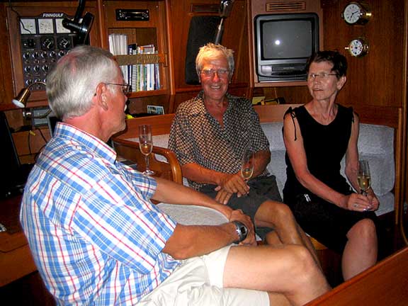 Seuraavana päivänä saimme odotetut vieraat. Hate ja Hetu vilkuttivat laiturilla kello 12 ja kapu nouti heidät kumpparilla kyytiin. Hetu ja Hate ovat olleet läheisiä ystäviämme melkein 30 vuotta ja Hatehan oli gastaamassa Melinan kannella Haukilahdesta Hampuriin. Jälleen näkemisen iloa, tuliaisia Suomesta ja muutama geetee. Niillä eväillä aloitimme yhteisen 10 päivän seilauksen.