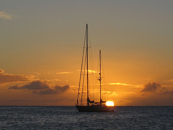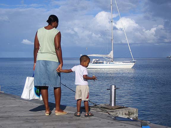 Torstaina tuulitarjonta oli edelleen suoraan idästä vajaa kymppi. Me jatkoimme eteenpäin ranskalaisterritorioon. Iles des Saintes on erittäin viehättävä pienten saarten rypäs Guadeloupen eteläpuolella. Pelkkä genua kiskoi meidät vajaassa kolmessa tunnissa perille 20 mailin päähän Saintesin rantaan. Täällä paperit tehtiin poliisitalolla, josta ne faksattiin Guadeloupelle, josta paluufaksi leimojen kanssa saapui vajaassa tunnissa. Sillä välin kapu ehti ottaa paikallisen romminäytteen. Illalla Hate osoitti mestarikokin elkeitä paistamalla herkulliset tonnikalapihvit veneessä. Hämmästyttävää, että samasta tavarasta pystytään tekemään niin mautonta purkkiruokaa.
