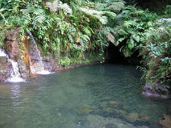 Me taas lähdimme maihin ja menimme kiertelemään kaupunkia. Aika pittoreski paikka, jossa erilaiset rakennustyylit kohtaavat seinä seinää vasten. Toinen on nykyaikainen, hyvin maalattu kivitalo ja toinen vanhoista tynnyreistä kyhätty rakennelma, jota ei edes paatunein rakennustarkastaja voisi nimittää asumukseksi. Parin tunnin kiertelyn jälkeen kokoonnuimme hotellin eteen, josta oppaamme Glen poimi Melinan neljän hengen joukkueen ja puoli tusinaa muita hotellin asukkaita retkelle sademetsiin ja putouksille. Reitti kiemurteli kapeita vuoristoteitä yhä ylemmäksi ja reilun tunnin ajon jälkeen jalkauduimme. Ison puun kyljessä oli kyltti "Titou Gorge". Oppaamme lähti edellä kantaen selässään sinisiä kellukevöitä. Vielä emme tienneet miksi. Vartin jälkeen tulimme vuoren reunaa valuvan pienen joen levennys kohtaan. Glen heitti paidan pois ja käski meitä vaihtamaan uimapuvun päälle. Vieläkään emme tienneet mitä tästä seuraisi. Katselimme kaikki toisiamme epävarmoina ja pikkuhiljaa menimme oppaan perässä pieneen jokiuomaan, jossa vesi oli huomattavan viileätä, kapun mielestä suorastaan kylmää. Opas antoi kaikille kellukevyön ja komensi meidät peräänsä. Lähdimme uimaan vastavirtaan kapeaa uomaa luolan sisälle. Valo katosi melkein kokonaan ja hämärässä räpiköimme noin 50 metriä eteenpäin vastavirtaan. Vesi oli kovertanut itselleen reitin, joka oli noin kolmisen metriä leveä ja paikoin puoli metriä, paikoin kolmisen metriä syvä. Toisessa päässä luolan sisällä oli noin viisi metriä korkea putous, josta vesi virtasi vuolaasti alas luolaan. Tästä virrasta piti vielä uida toiselle puolelle, josta löytyi veden kovertama parin neliön kokoinen kalliotasanne. Sullouduimme sinne seisomaan koko joukkue, joten ahdasta oli kuin ruuhkabussissa. Hytisimme kylmästä ja iloitsimme omasta rohkeudestamme. Ei nyt ihan joka turisti tähän luolaan uisi sisään. Ei ainakaan Caribian lemmenlaivojen amerikkalaistädit.