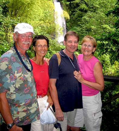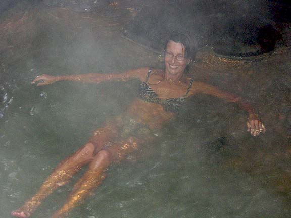 Puoli tuntia myöhemmin istuimme taas pikkubusassa ja olimme tyytyväisiä, ettei Nissanista löytynyt ilmastointilaitetta. Matka jatkui huiman jyrkkiä ja kapeita teitä puolisen tuntia ja sitten saavuimme Trafalgar Fallsin kulmille. Parin kymmenen minuutin kävely johdatti meidät viidakkoputoukselle, jonne loppumatka tehtiin märkien ja liukkaiden kivien päällä taiteillen. Pienikin horjahdus tai jalan lipeäminen olisi johtanut helposti paikallisen lasaretin kipsausosastolle. Huimat olivat maisemat, mutta ei tässä kaikki. Oma erikoisuutensa olivat vielä kuumat lähteet, joissa saattoi istua kuin paremmassakin porealtaassa. Tämä retki oli todella hintansa väärtti.