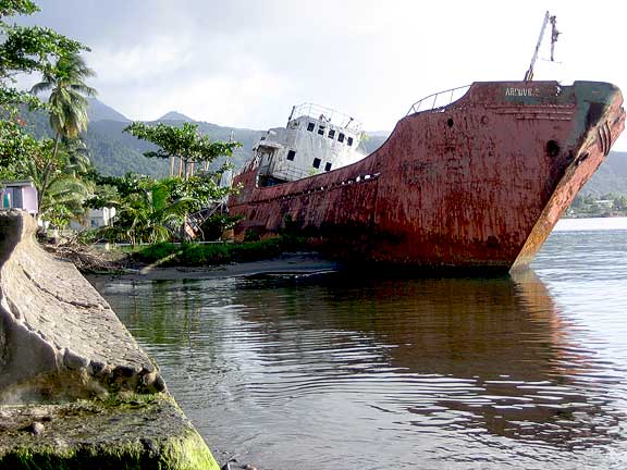 Jatkoimme Dominican länsirantaa parikymmentä mailia pohjoiseen, josta löytyi seuraava kotataajama eli paikallinen kaupunki Portsmouth. Varasimme pöydän rannan Purple Turtle Restaurantista ja lähdimme kylille. Paikan mielenkiintoisimmat nähtävyydet olivat kolme rahtilaivaa, jotka hurrikaani David oli parkkeeranut rannan reunaan vajaa 10 vuotta sitten. Aika siistin näköinen talo rannalla oli saanut olohuoneen ikkunan eteen viiden metrin päähän 50 metrisen rahtilaivan hylyn. Luulisi vähän harmittavan. Toinen mieleen jäänyt yksityiskohta oli Finlandia-vodkan mainoskilpi. Tavara tuli kuulemma maailman huipulta, mutta meille maistui paremmin paikallinen rommipunssisekoitus.
