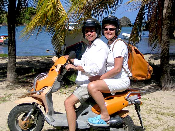 Aamulla vuokrasimme skootterit, joilla sitten kiertelimme koko päivän Iles des Saintesin pääsaarta Terre d´en Hautia. Hatelle ja Hetulle se oli oikein nostalginen kokemus. He olivat tavanneet toisensa yli 40 vuotta sitten, jolloin Hate oli kurvaillut treffeille skootterilla. Vieläkin näytti yhteinen skootteriajelu herättävän tunteita. Saaren pohjoiskulman huipulta löytyi Fort Napoleon, jonka uumenissa oli hieno museo kertomassa aikakauden sotaisasta historiasta. Saaren rantaravintola Les 3 Boats tarjoili illalla parastaan; herkullinen ranskalaisateria, jonka jälkeen ei tarvinnut snakaria.