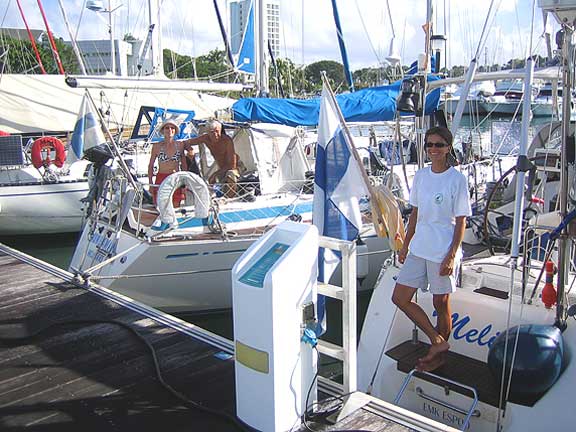 Kapu lähti etsimään tullia, mutta viikonloppu oli selvästi väärä aika saapua maahan. Ei ollut paikalla konttorissaan, mutta ehkä syväsatamassa. Siis sinne. Matkaa oli muutama maili, joten Honda sai kunnolla töitä jollan perässä. Tullimies ei vaan ollut sielläkään. No, ei siinä muu auttanut kun nostaa keltainen Q-lippu saalinkiin ja jäädä odottamaan aamua, josko silloin saisimme tullauksen ja maahantulon kuntoon. Kapu sai kuitenkin maksettua pari yötä poijussa Fort Young Hotellin sukelluskeskukseen, josta saimme varattua myös retken saaren sademetsäalueella oleville putouksille. "Pikkubussi vie perille ja retki kestää 3-4 tuntia, ottakaa mukaan uimahousut, hinta 20 US dollaria" opasti sukelluskeskuksen ystävällinen virkailija.