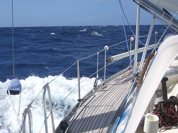 Ennen Antiguaa olisi käytävä vielä kirjautumassa pois Ranskan kohteliaisuuslipun vaikutuspiiristä ja siihen sopivin paikka oli Deshaiesin ankkurilahti, joka sijaitsee Guadeloupen luoteiskulmassa. Meillä oli sinne matkaa saman verran kuin Haukilahdesta Skrubarille, joten torstaina aamupala tuli nautittua vasta kymmeneltä. Pelkkä genua keulassa riitti tähän matkantekoon ja iltapäivän alussa olimme Deshaiesin kulmalla. Sitten alkoi tuulla. Nykäsimme rullan sisään sähkövinssillä ja ajoimme 15 metrin tuulessa ja kaatosateessa sisälle lahteen. Sitten tuli sopiva tauko; tuuli tippui viiteen metriin ja sade muuttui pelkäksi tihkuksi. Laskimme ankkurin ja melkein kaiken kettingin veteen. Kapu peruutti koneella ja veti kiristyvää ankkurikettinkiä suoraksi. Lopuksi oli pari tuhatta kierrosta koneessa, mutta vene tuntui hyvin pysyvän paikallaan. Försti oli keulassa ja piti kädellä kiinni ankkurikettingin päältä saaden siten varmuuden siitä, että ankkuri ei tule mukana. Siellä oli ja pysyi. Vedimme luukut kiinni ja kaivoimme isot pyyhkeet, joihin saimme kuivattua itsemme. Olimme todella likomärkiä.