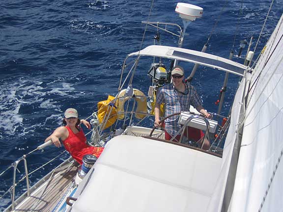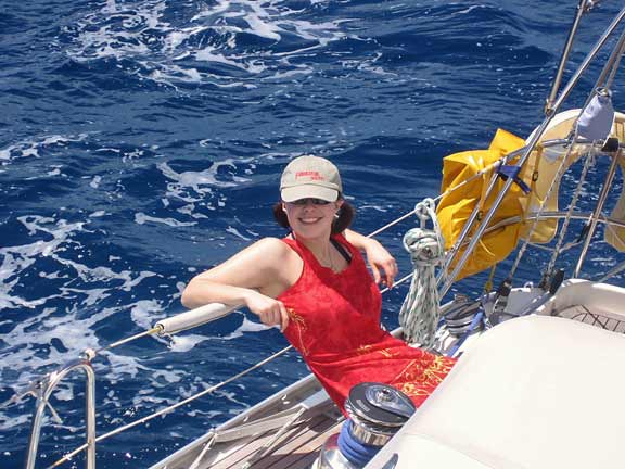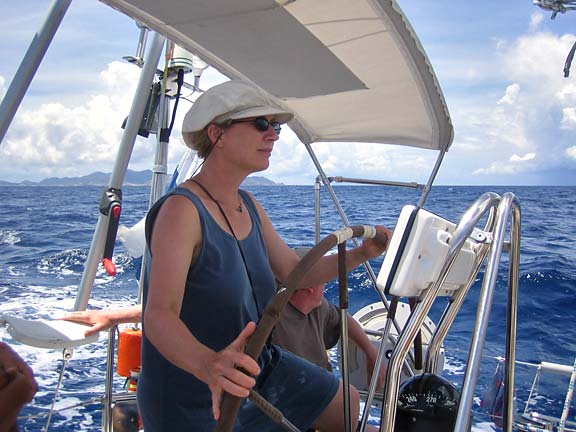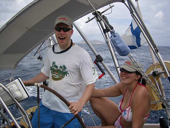 Perjantaina jatkoimme vaihteeksi brittiläisen imperiumin puolelle. Anguillan Road Bay odotti taas 30 mailin päässä uusia vieraita. Tuuli oli palannut takaisin normaalisuuntaansa eli itäiseksi. Tehoa tarjoiltiin mukavat 6 - 7 metriä, joten Melinan perävana kuohui komeana seitsemän solmun nopeudessa. Kertakaikkiaan mukavaa menoa, jossa vähemmällä merikokemuksella varustetut vieraammekin viihtyivät, vuoroin ruorissa, vuoroin keulapulpetissa nauttimassa vauhdin hurmasta.