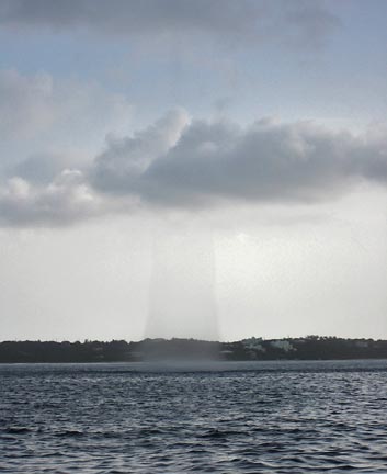 Kun lähdimme ajamaan takaisin Road Bayn ankkurilahteen, kapu huomasi veneen vieressä noin 50 metrin päässä jotain outoa liikettä. Vesi ikään kuin pyöri sumuna ja nousi ylöspäin. Vilkaisu biminikatoksen alta taivaalle vahvisti epäilyn. Tummasta pilvestä tuli alas vaalean harmaa suppilo, jonka putki ulottui veteen asti. Trombi oli syntynyt aivan vieressä. Nyt tuli kiire. Volvosta löytyi melkein kolmetuhatta kierrosta ja Melina kynti vihreää vettä peräaskelma veden alla. Trombi kasvoi koko ajan ja liikkui hitaasti itään, me ajoimme etelään. Viidessä minuutissa se oli kasvanut todella pelottavan kokoiseksi ja samalla koko taakse jäävä taivaanranta muuttui sameaksi peittäen kaiken näkyvyyden. Volvon nelilapainen kauhoi vettä riuskemmin kuin koskaan ennen ja saimme tehtyä etäisyyttä trombin keskukseen, jonka halkaisija oli jo vähintään 50 metriä. Noin varttituntia myöhemmin se päätti kuitenkin rauhoittua ja pikkuhiljaa suppilo katosi taivaalta. Ilma muuttui kirkkaaksi ja puoli tuntia ilmiön synnystä kaikki oli ohi. Huima luonnonnäytelmä, jota ei toivottavasti kohtaa tätä lähempää.