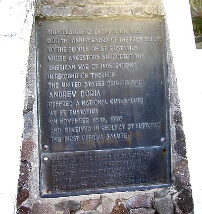 St.Eustatius oli myös ensimmäinen paikka, jossa toinen valtio tavallaan tunnusti Yhdysvallat. Vapaussodan jälkeen 1776 amerikkalainen sota-alus Andrew Doria tuli satamaan ja ampui kohteliaisuuslaukaukset. Paikallinen hollantilainen kuvernööri ei oikein tiennyt miten toimia, mutta vastasi sitten samalla mitalla ja osoitti siten laivastoperinteiden mukaista kunniaa toisen valtion sota-alukselle. Tämä taas ei miellyttänyt brittejä, joita muutenkin harmitti Hollannin asekauppa kapinallisten kanssa. Se johti taas uuteen sotaan Hollannin ja Britannian välillä, jonka seurauksena britit valtasivat saaren hollantilaisilta.