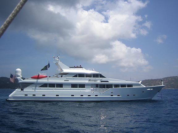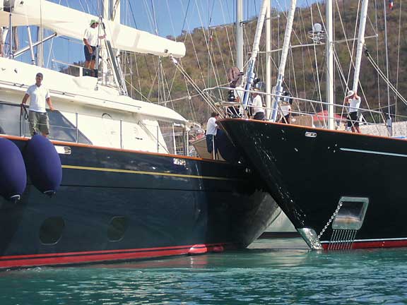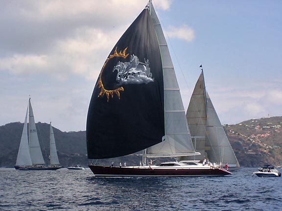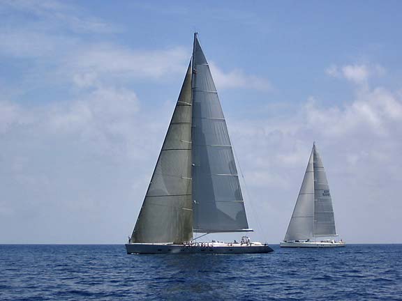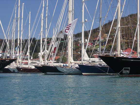 Seuraavana päivänä puolipilvinen taivas armahti vaaleaihoisia vieraitamme, joiden päivittäiseen rutiiniin kuului jatkuva rasvaus. UV-30 oli parasta mitä kaupasta oli löytynyt; sitä kului runsaasti. Tuuli pysytteli sitkeästi kaakon kulmilla tarjoten meille tiukkaa luovia kohti Gustaviaa. Kevyillä keleillähän kryssi on parasta nautintoa ja siinä Melina on aika vekotin. Taas näimme valaan. Nyt iso pyrstö taputteli vettä muutaman kaapelin päässä. Ei tehnyt mieli mennä lähemmäksi. St.Bartsin satamassa odotti huima näky. Jo kaukaa olimme nähneet korkeita mastoja, mutta vasta Gustavian laiturissa selvisi syy. St.Barts Bucket Regatta oli tulevana viikonloppuna yhdettätoista kertaa. Eikä ihan tavallinen regatta. Osallistujaveneet olivat maailman suurimpia ja hienoimpia megajahteja. Tämä pikkukisailu oli tarkoitettu vain yli satajalkaisille, joita lähtölistalta löytyi 30 toinen toistaan hienompaa yksilöä. Vain kerran samanlainen kokoelma superjahteja on ollut koolla; Millenium Cup Uudessa Seelannissa vuonna 2000.