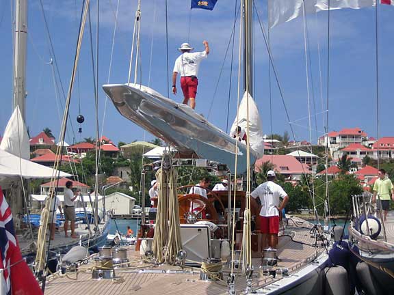 Perjantaina palasimme takaisin St.Bartsille seuraamaan regattaa. Tuulimittarin lukemat olivat surkean ja säälittävän rajamailla. Kerran oli melkein kaksi metriä, suoraan takaa. Volvo lauloi tasaista hurinaansa ja me etsimme biminikatoksen alta suojaa auringon paahteelta. Megajahdit näkyivät St.Bartsin rannan reunaa vasten ainakin 20 mailin päästä. Siellä ne seisoivat tyynessä, valtavat purjealat eivät saaneet niihinkään vauhtia. Juuri kun saavuimme saaren laitaan tuli ilmoitus ensimmäisen kisapäivän keskeytyksestä. Dinosaurukset lähtivät kohti Gustaviaa, jonka rannassa kansa seisoi laitureilla ihmettelemässä alusten manööverejä ahtaassa satamassa.