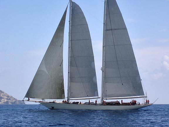 Lauantaina oli uusi yritys. Ajoimme aamulla jollalla satamaan katsomaan näitä maailman upeimpia purjeveneitä. Jos nyt 50 -metristä voi kutsua veneeksi. Veneiden kansilla miehistöt valmistautuivat päivät starttiin ja ensimmäiset veneet nostivat ankkureitaan. Kapu kaipasi kuolalappua kaulaan, kun vanhat, mutta superhienosti entisöidyt J-veneet sy Endeavour ja sy Ranger lipuivat ohi. Kapu arvioi silmämitalla regatan veneiden arvoa; tuhat miljoonaa markkaa tuntui alkuun riittävältä, mutta tarkistuslaskelma laskukoneen kanssa osoitti, että 500 miljoonaa euroa on lähempänä oikeata. Näille kulmille ei ole köyhyyttä riittänyt. Kello yksitoista olimme takaisin Melinan kannella lähtölinjan vieressä. Aika ymmärrettävistä syistä tämän koko luokan veneet lähtivät kisaan takaa-ajolähdöllä. Laivueen suurimmat, mutta myös raskaimmat lähtivät ekoina. Yli 50-metriset ja kolmikerroksiset uivat palatsit lipuivat parin solmun vauhtia starttilinjalle, jossa genaakkerisukat aukenivat. Kannella hääri melkein 20 henkeä, komentosillalla vielä muutama. Aluksen vieraat omassa aitiossaan jännittivät menoa cocktail-lasit kädessään. Heitä varten oli oma henkilökunta. Perään lähtivät muutamien minuuttien välein seuraavat kaunottaret, loppupäässä valtavan pitkät ja matalat J-veneet, joissa ei ole edes kaiteita. Mahtaa niillä saada huimaa kyytiä, kun oikein tuulee. Takaa-ajajina kaikille olivat 37 -metrinen sy Ghost ja 45 -metrinen sy Visione, jotka edustivat viimeisen päälle modernia suunnittelua ja toteutusta. Niissä kaikki mahdollinen oli tehty hiilikuidusta ja muista eksoottisista materiaaleista. Näillä veneillä on vain yksi tarkoitus: olla nopeampia kuin mikään muu yksirunkoinen vene. Ghostin masto kohosi melkein 60 metrin korkeuteen, ja siellä yksi miehistön jäsen killui puosuntuolissa. Hän tutkaili tuuliraitoja ja etsi parasta reittiä heikossa tuulessa välittäen tiedon vhf-puhelimella aluksen taktikolle. Aika mielenkiintoinen paikka hoitaa päivystävän meteorologin tehtävää.