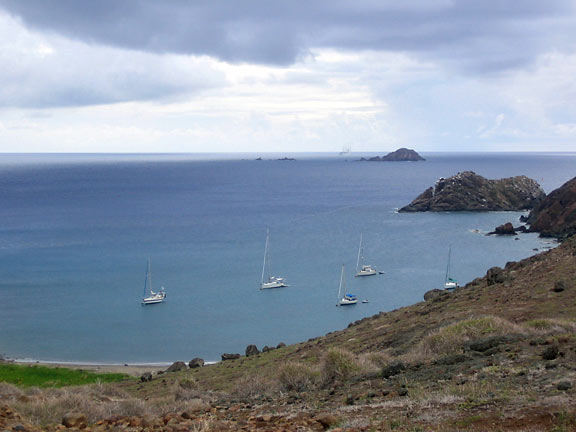 Aamulla teimme kaupunkikierroksen, koska Eijan ja Otson edellinen alus oli passannut St.Bartsin. Kylä tuli nähtyä kunnolla, kapukin löysi yhden uuden kadun, jota ei ollut ennen lampsinut. Pakko todeta; ei yhtään pahempi paikka, jos nyt sattuu tykkäämään asumisesta Caribian kulmilla. Sivistyksen vastapainoksi me lähdimme iltapäivän lopulla paikalliseen luonnonsatamaan. Ile Fourche on neljä mailia Gustaviasta luoteeseen ja todellakin asumaton pieni saari, jonka leessä on mukava ankkurilahti. Saarella on yksi asumus, jota paikallinen vuohipaimen joskus käyttää. Nyt hänkin oli poissa, joten Förstin ja Eijan luontoretki tarjosi nautittavaksi aution ja karun kalliosaaren kauneuden.