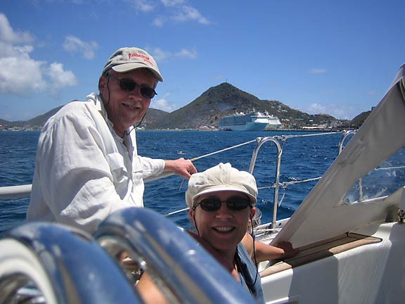 Eijan ja Otson viimeinen seilauspäivä valkeni aurinkoisena ja itätuulikin puhisi tuhdisti. Pelkkä keula riitti saaren kiertoon. Luovimme eteläreunaa itään ja leikkasimme yhden luovin Hollannin puolen pääkaupungin Philipsburgin sataman edestä. Siellä oli laiturissa italialaisen Costa -varustamon 300-metrinen, juuri se, jolla Eija ja Otso kiertelivät Pikku Antillien saaria viikon verran. Melinan kannella tuli kokeiltua se toinen tapa. Taisi maistua tämäkin.