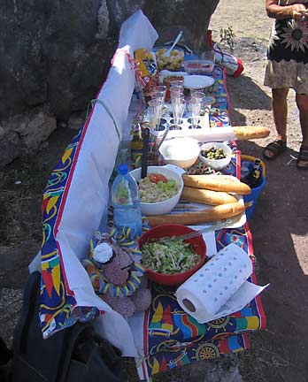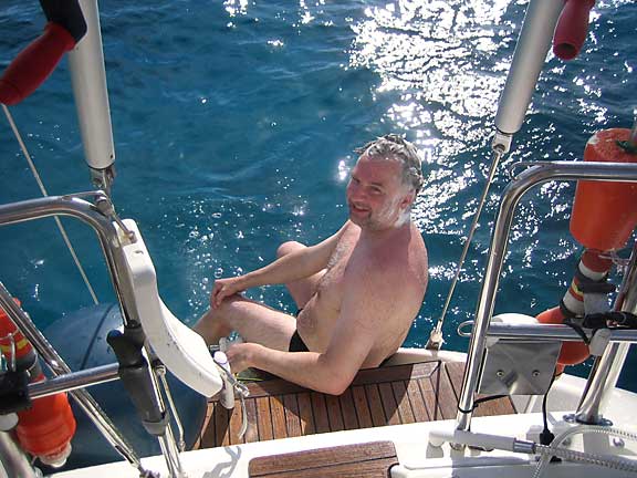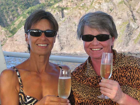 Erinomainen oppaamme kärräsi meidät takaisin rantaan, josta taiteilimme itsemme takaisin Melinan keikkuvalla kannelle. Nostimme taas Hondan ja jollan kyytiin ja palasimme muutaman mailin saaren länsilaidalle tyynempään veteen pulikoimaan vielä kerran ennen matkan jatkamista. Lounasjuomaksi tarjoiltiin Hannan tuliaispullosta shampanjaa, jolla tytöt skoolasivat itsensä Saban prinsessoiksi. Olisikohan siellä kunkun paikka vapaana, mietti kapu.