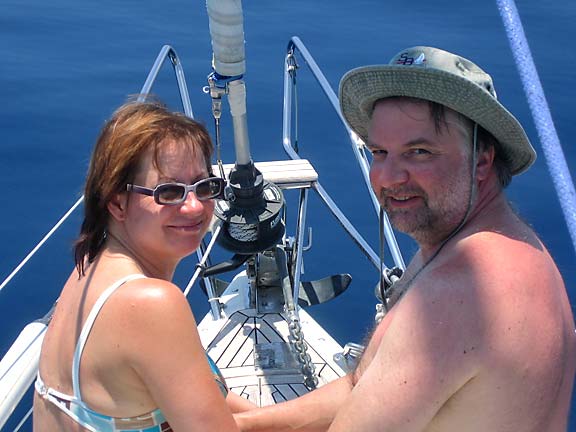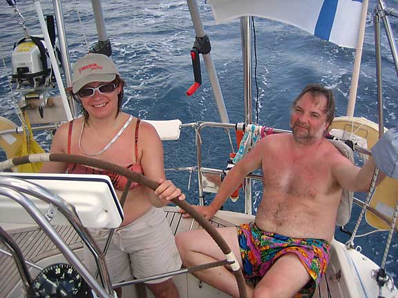 Kantahenkilökunnan lisäksi Melinan kannella oli pari valkolaista suoraan Suomesta. Kapun kollega Bobi ja nuorikkonsa Sanna olivat pitkäperjantaina lentäneet Tampereelta St.Martinille. Bobi on ollut aiemminkin pari kertaa kanssamme näillä vesillä charter-veneillä, joten jutun juoni oli tuttu. Sopivasti seilausta, paljon uintia ja snorkkelointia sekä runsaasti uv-suojavoiteita.