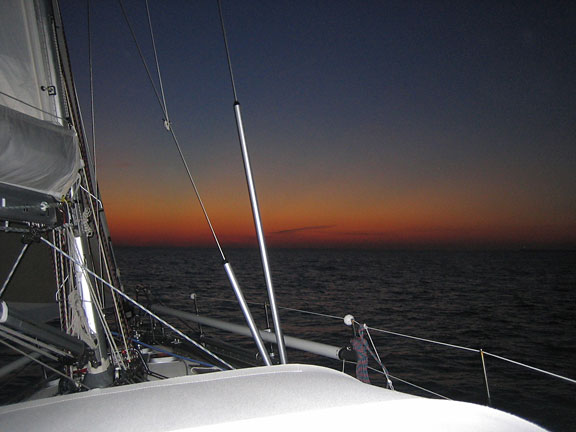 Sunnuntai iltana saavuimme Hollannin rannikon edustalle, jossa illan pimetessä ympärillä oli noin miljoona valoa. Laivoja, kalastusveneitä, purkkareita, öljynporauslauttoja, loistoja ja poijuja. Surfilautoja ei näkynyt. Tutka pyöri kaiken aikaa, itse asiassa puolitoista vuorokautta yhteen menoon. Juuri auringon laskun hetkellä teimme taas vendan ja nyt vuorostaan kakkosgenuan takaliikkiin syntyi metrinen pystyrepeämä. Alashan se piti ottaa, viikata, pakata ja vaihtaa keulaan kolmosgenua. Siihen ähellykseen kului taas muutama tovi. Koko yön jatkoimme luovimista koilliseen ja aamun valjetessa ja tuulen keventyessä vaihdoimme keulaan enemmän tavaraa. Cowesissa korjattu rullagenua sai tuuletusvuoron ja taas saimme kuutisen solmua lokiin. Itäfriisien saaret häämöttivät horisontissa ja Helgoland jossain 150 mailin päässä itäkoillisessa.