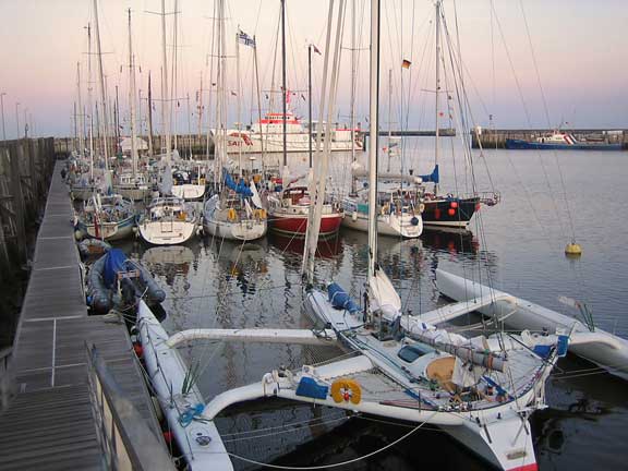 Aurinko paistoi lämpimästi koko matkan ajan ja yötkin olivat vain viileitä, koska tuuli puhalteli mantereelta päin. Ajoimme enimmäkseen ruori lukittuna, jolloin Melina itse toimi tuuliperäsimenä ohjaten koko ajan 30 asteen apparenttikulmalla. Saimme tekstarin sy Tarinan Reijolta, Aulilta ja Erikalta; he olivat Helgolandissa ja lupasivat odotella meitä siellä. Oma ETA:mme oli 18 tuntia, mutta kaikki viimeisetkin sata mailia olivat niin nenästä kuin mahdollista, joten sekin venähti muutamalla tunnilla. Tiistaiaamuna näimme Helgolandin korkeat törmät ja hitaasti luovimme nyt vuorostaan kahden solmun vastaisessa virrassa kohti satamaa. Yhdentoista maissa 4. päivä heinäkuuta saavuimme Helgolandin satamaan ja kiinnityimme samaan letkaan, jossa olivat sy Tarina ja myös toinen suomalaisvene sy Saranne. Matka Doverista kesti noin kolme vuorokautta ja kaikki 400 mailia olivat pystykryssiä. Ei heti tullut mieleen, milloin viimeksi on luovinut tällaisen matkan yhteen menoon. Olimme kuitenkin virkeitä ja aloimme nauttia samantien Helgolandin satamaelämästä Aulin, Reijon ja pikku-prikan kanssa. Me isommat otimme sen perinteisen kaksilla perunoilla.