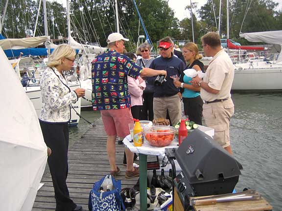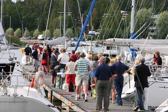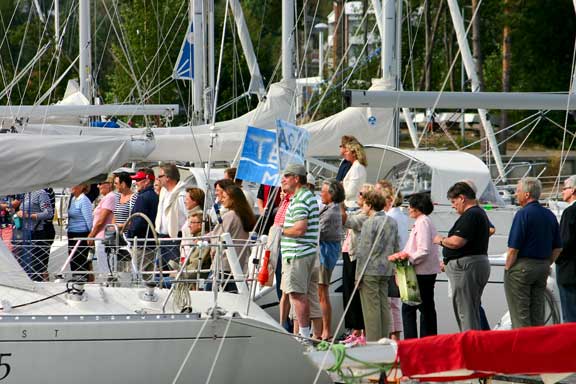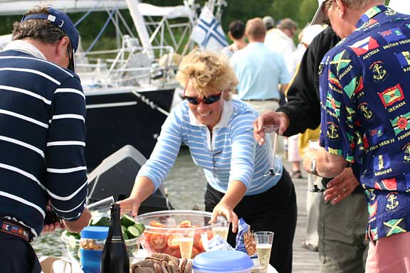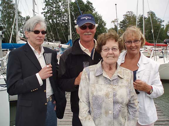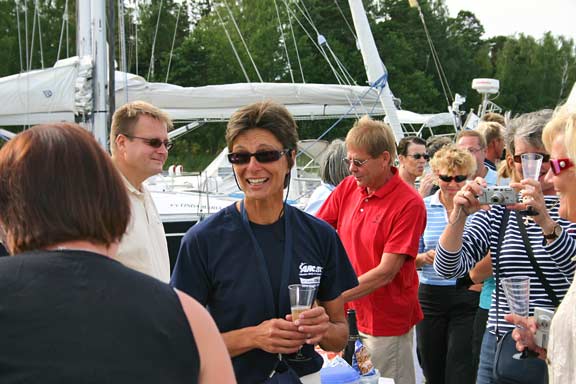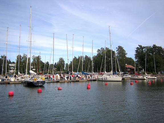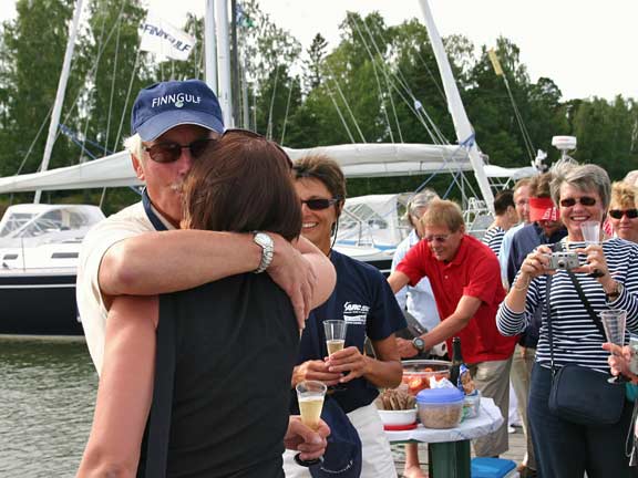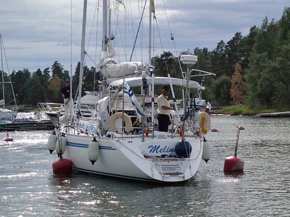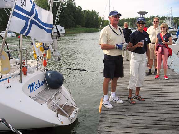 Laituri oli täynnä ystäviä ja sukulaisia. Tervetuloa Melina -banderolli liehui korkealla ja musiikki soi. Grillit, herkkupöydät ja baarit täyttivät laiturin vastaanottajien ohella. Kello 17.07 förstin jalka kosketti laituria ja kapu hyppäsi kohta perässä. Ystävät hurrasivat ja taputtivat. Nyt alkoi loputon halausten virta. Kapu yritti ääni väristen kuvata tunnelmiamme ja kiittää kaikkia ihania ihmisiä, jotka olivat saapuneet vastaanottamaan Melinaa. Filmiä paloi ja kaikilla oli hymy herkässä. Upea trio soitteli kapun suosikkibiisejä ja välillä koko laiturillinen väkeä lauloi mukana. Aivan ihana fiilis. Hilut jatkuivat useamman tunnin ja herkulliset grillimakkarat tekivät kauppansa kuohuviinin kanssa. Sen jälkeen kapulle ja förstille lyötiin eteen tukkimiehen annos panna cottaa, ja kun siitä selvisi oli edessä valtaisa rasia herkullisia vadelmaleivonnaisia. Huokailimme ilosta ja onnesta; että meillä on tällaisia ystäviä. Vähän ennen puoltayötä saatiin nämäkin juhlat siirrettyä muistojen puolelle ja kömmimme veneen keulakajuuttaan nukkumaan vielä viimeiseksi yöksi. Kotiin ei ollut vielä kiirettä.